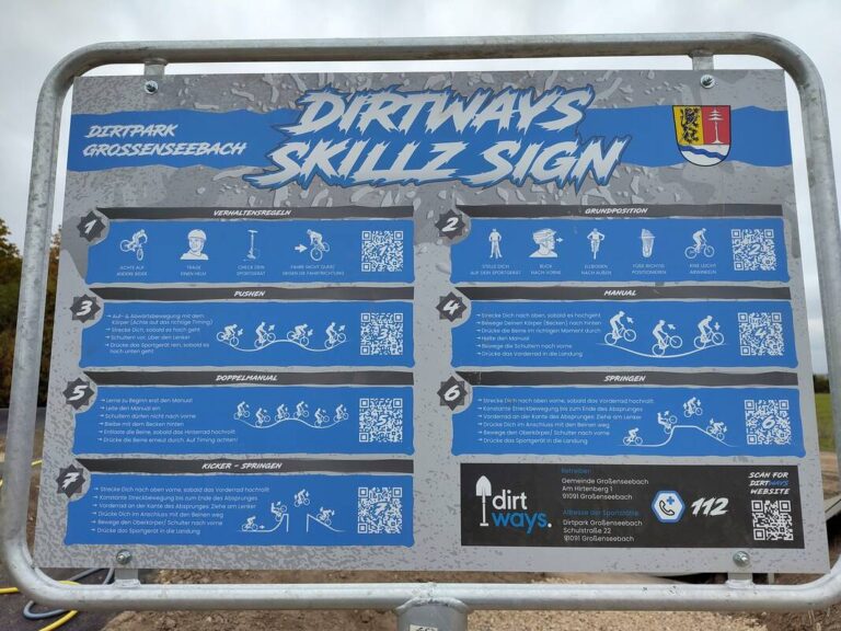 Die Anlage ist mit drei Schildern ausgestattet. Neben dem allgemeinen Hinweis zu Verhaltensregeln und Kontakt-Telefonnummern gibt es zwei sogenannte „Skill Signs“ mit QR-Codes. Scannt man diese ab, landet man auf YouTube und kann sich Erklärungs- und Übungsvideos für die Bewegungsabläufe für Anfänger und Fortgeschrittene ansehen. Gerade Anfänger sollten das nutzen, bevor sie ihre ersten Runden drehen.